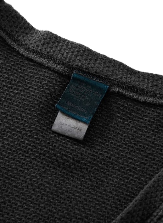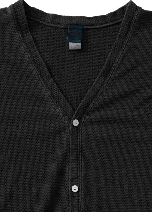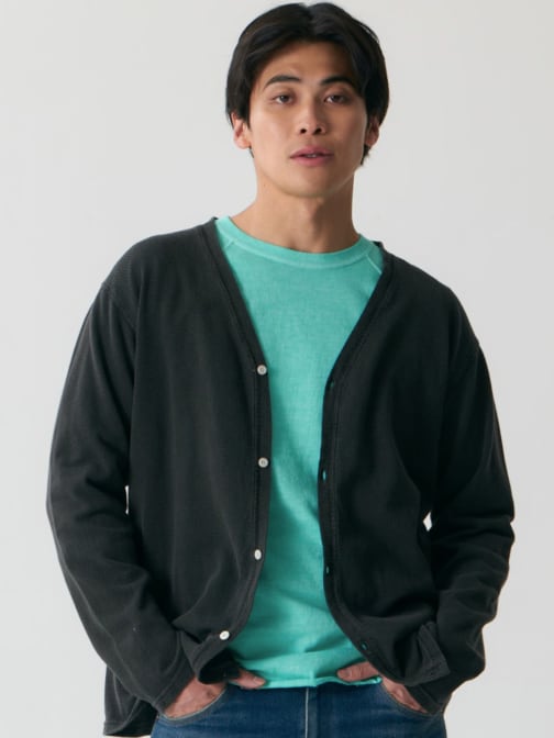 メッシュ状の生地とピグメント染め(顔料染め)カラーの相性がとても良く、生地の凹凸により色の濃淡が際立ち、顔料染めの特徴であるアタリや、味のある風合い感を存分に楽しむことができます。また、洗濯を繰り返していくと徐々に色褪せし、上質なヴィンテージ品のように経年変化を楽しむことができます。