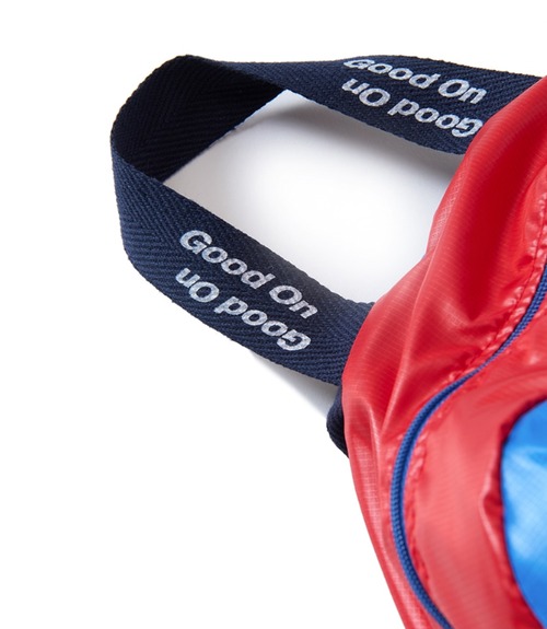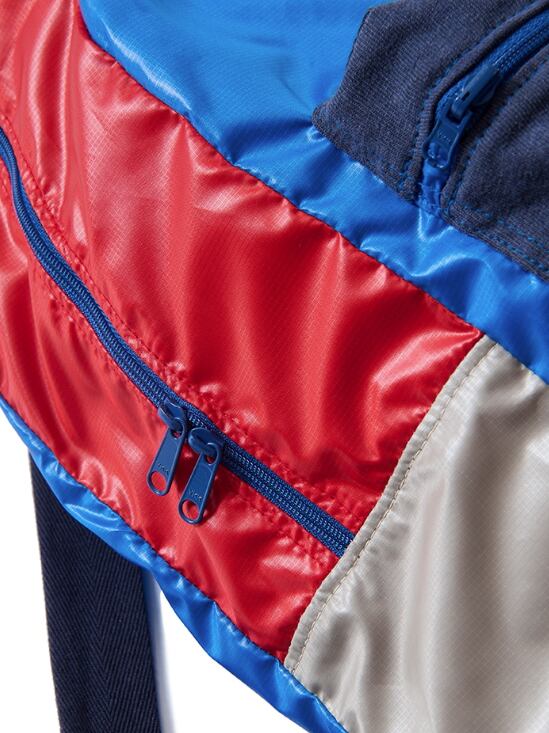デザインのアクセントにもなっている大ぶりなジッパー付きポケットの表地(P-ネイビーカラーのTシャツ生地)は、Tシャツの生産時に生じてしまう破材を使用しており、人にも地球にも心地良いエコなデイパックです。