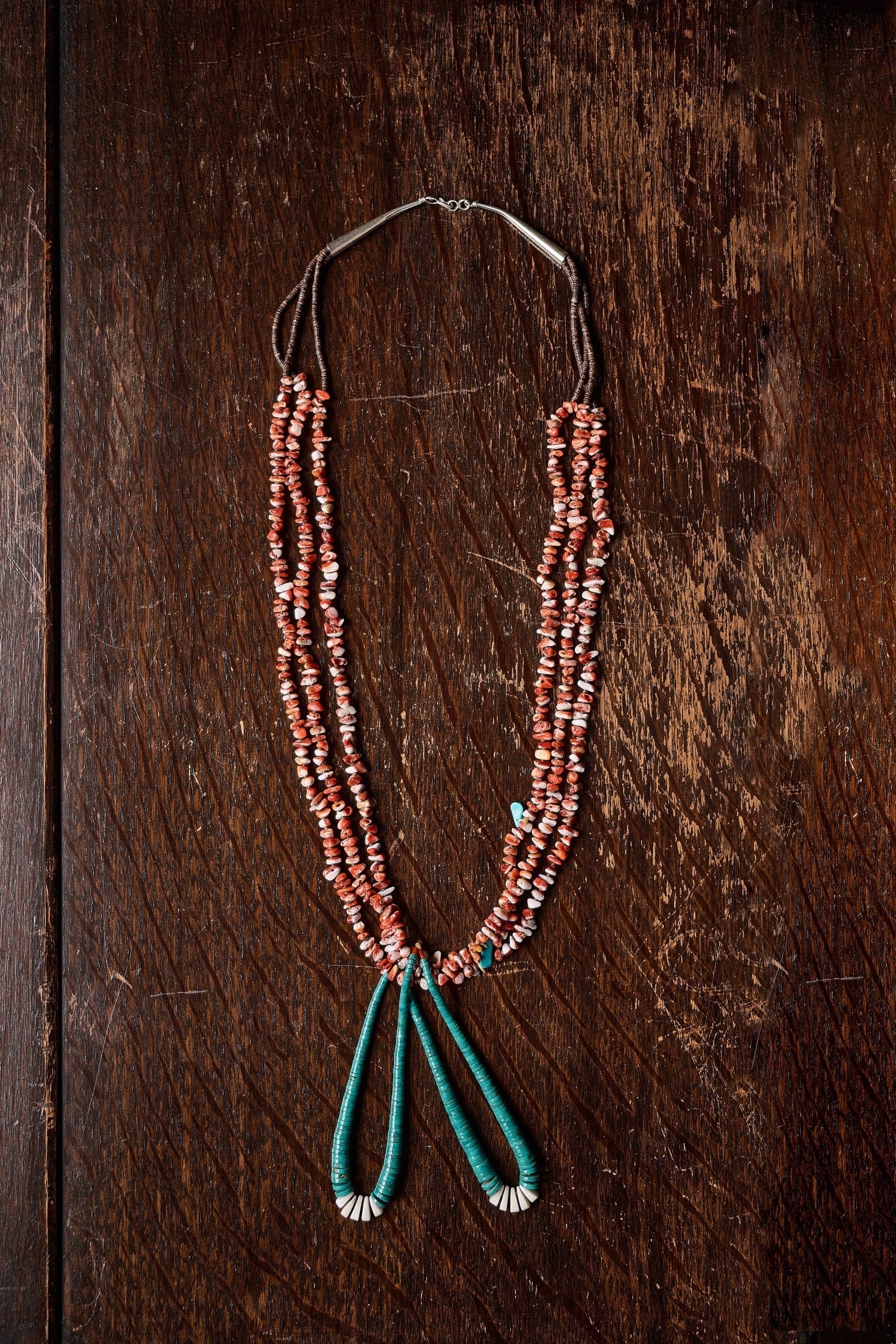 ネイティブアメリカンの正装に欠かせない神聖なジャックラスネックレスです。 ■サイズ ・長さ ネックレス長さ 80cm ・ジャックラストップ長さ 12cm ■年代、作者不明 ■モース硬度6 ■使用石:SPINY OYSTER SHELL(スパイニーオイスターシェル) ■石言葉:富の象徴、新しい自分への導き ※石や貝は素材の性質上無数の傷や穴がございます。
