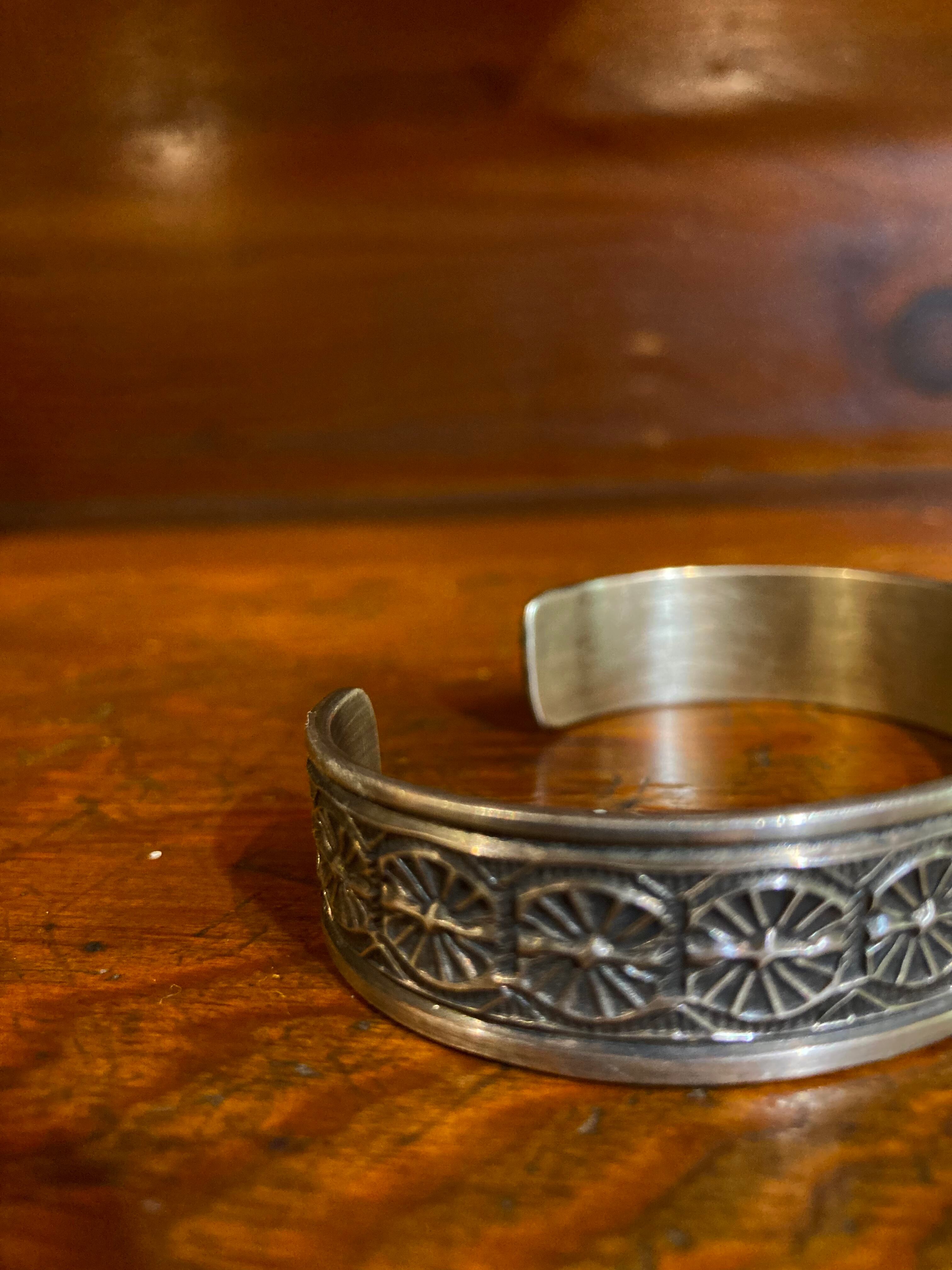 Navajo ナバホ族 Henry Mariano (ヘンリー・マリアーノ)のバングルです。 ヘンリー・マリアーノは、繊細で大胆なスタンプワークを得意としています。 バングル裏には、アーティストネーム【HRM】が刻印されています。 ■素材 Sterling Silver ■サイズ 幅:1.5cm 外周 17.5cm(開口部含まず) 開口部:3.6cm ※表記サイズには多少の誤差があります。