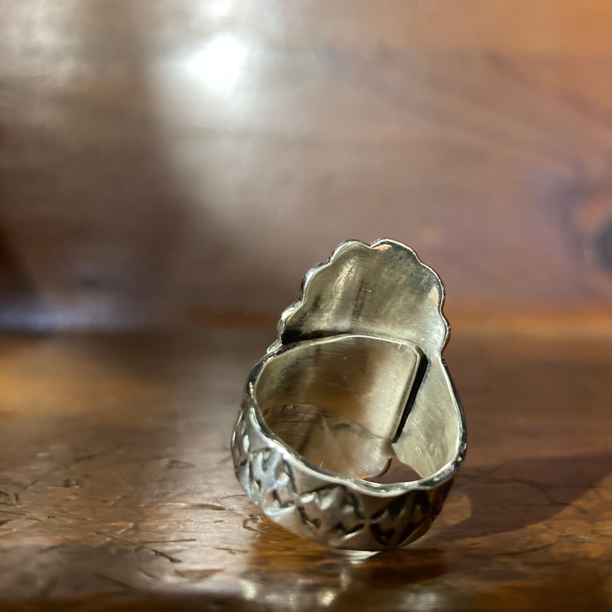 ■アーティスト ナバホ族 KEVIN RAMONE(ケビン・ラモーン) ■Material スターリングシルバー ■サイズ 幅:3cm ×1.8cm ターコイズ:7㎜×5㎜ ※表記サイズには多少の誤差があります。 シルバーのスカーフリングです。サイズ調節できる為、リングとしても使用できます。 男女兼用でお使いいただけてギフトにもおすすめです!